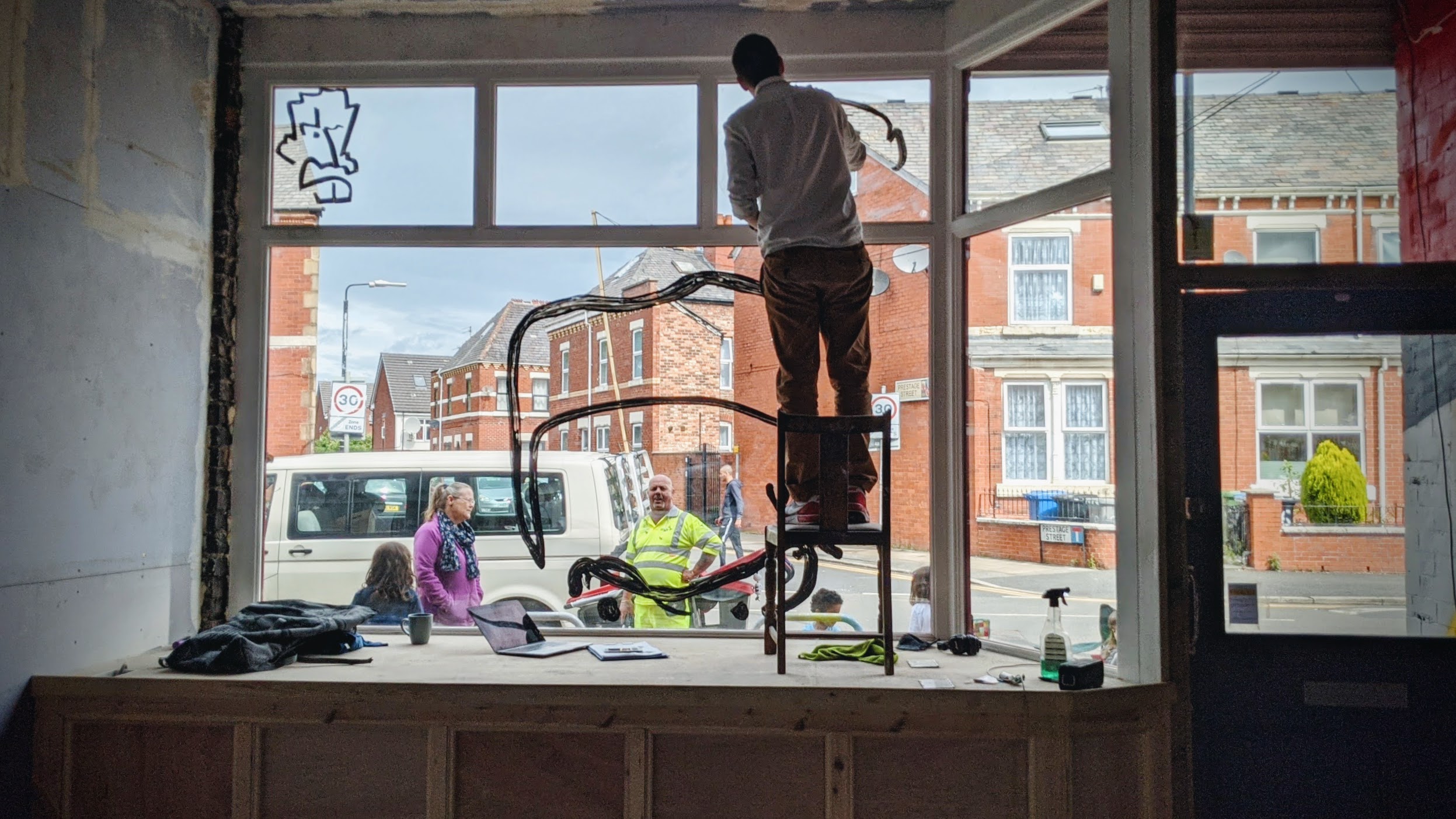 On Monday 22nd June Illustrator Oliver East took over our Window space as part of our #staycreativeOT project to create a series of illustrations drawn directly onto the windows. The portraits are all of local people that Oliver has drawn whilst walking around Old Trafford and Moss Side, the middle one at the top is of a local young boy who was watching him in the window. We broadcast this event live throughout the day and passers by enjoyed watching the progress and some even took the time to do their own drawings.