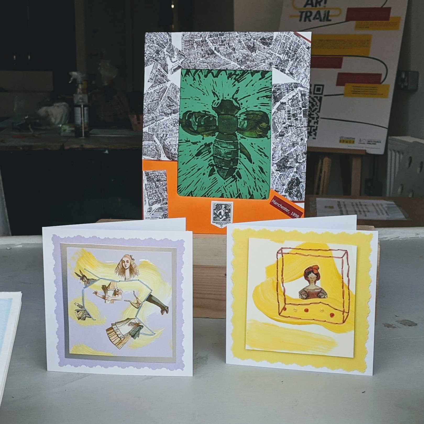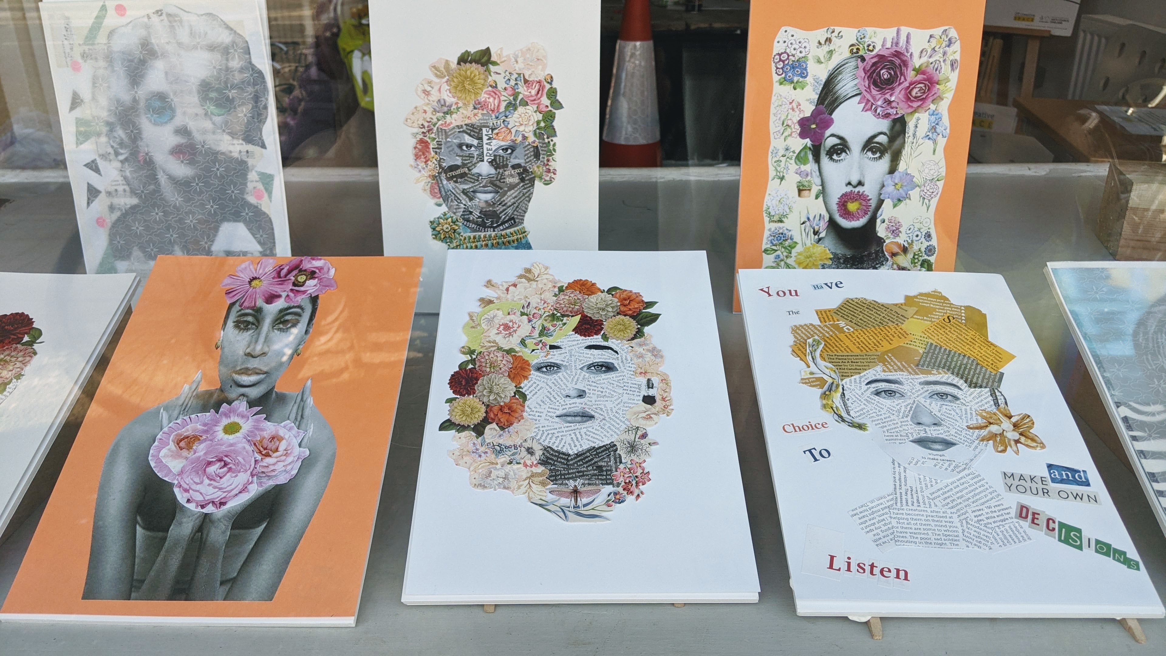 We are very pleased to present on display in the window a selection of drawings, collage, prints and cards by Mixed media Artist Penelope Nyau. She shares a bit more about her practice, interests and inspiration below.