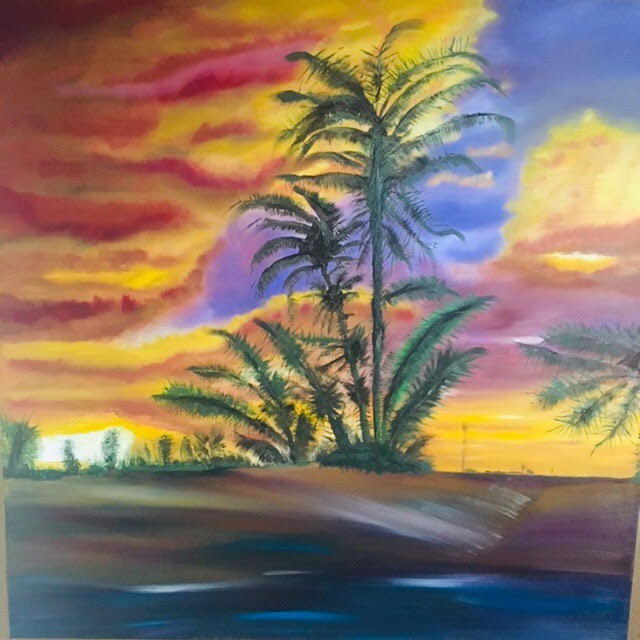 100cm x 100cm Painted with oils on canvas. On the 28th August 2019 as tropical storm Dorian approached Barbados 🇧🇧 I was checking on my children’s fathers family who live there. I noticed many people were sharing photos of the Sky has the hurricane passed the island. I was taken back how beautiful the sky looked and the colours were spectacular changing from yellow, to bright orange then red and then to rich purple, it was one of the richest sunsets I have ever witnessed on the island . Luckily a resident captured this and shared the photo which I asked permission to paint it as it was very beautiful yet very