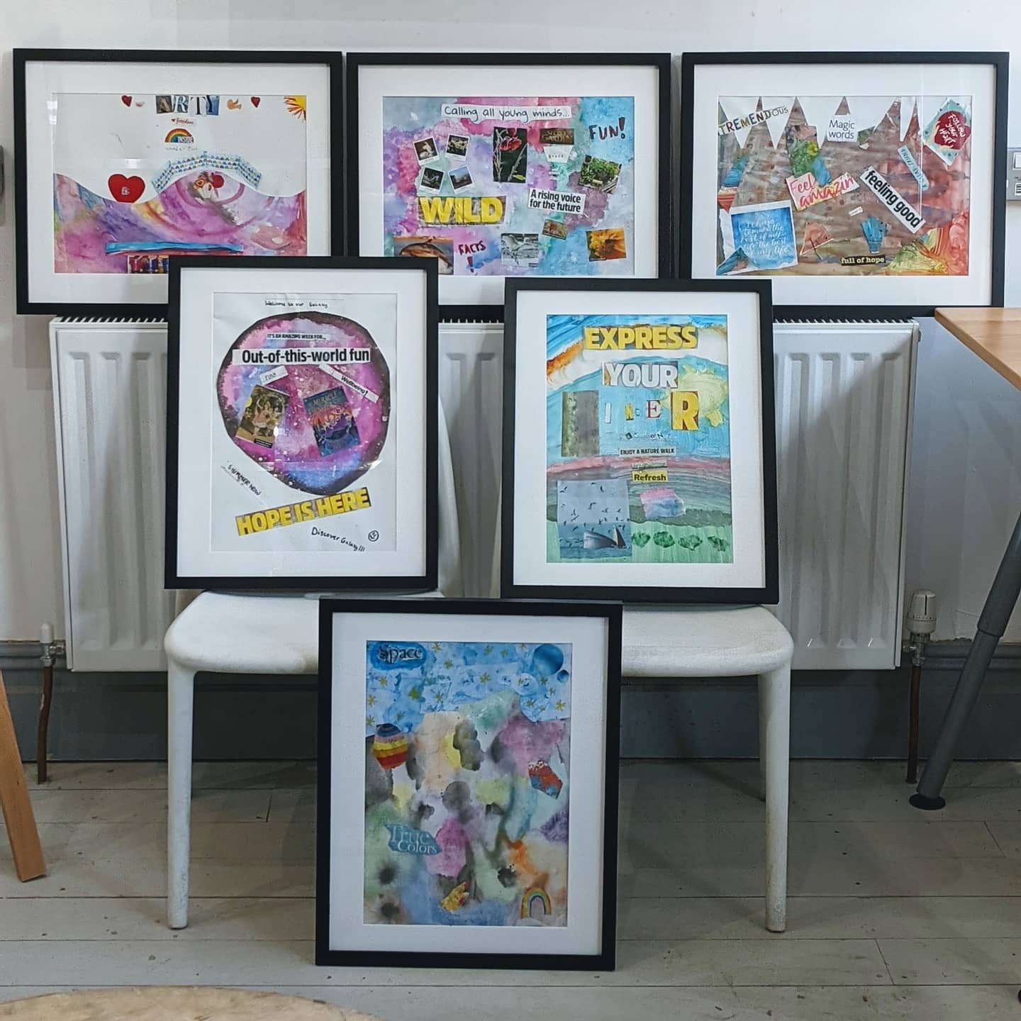 Then in May 2021 we were able to Host an in person workshop for the girls group at The OT creative SPACE Studio. They produced fabulous paintings expressing themselves through colour which they adapted with collage to create these beautiful images, which are now on display in The Window.