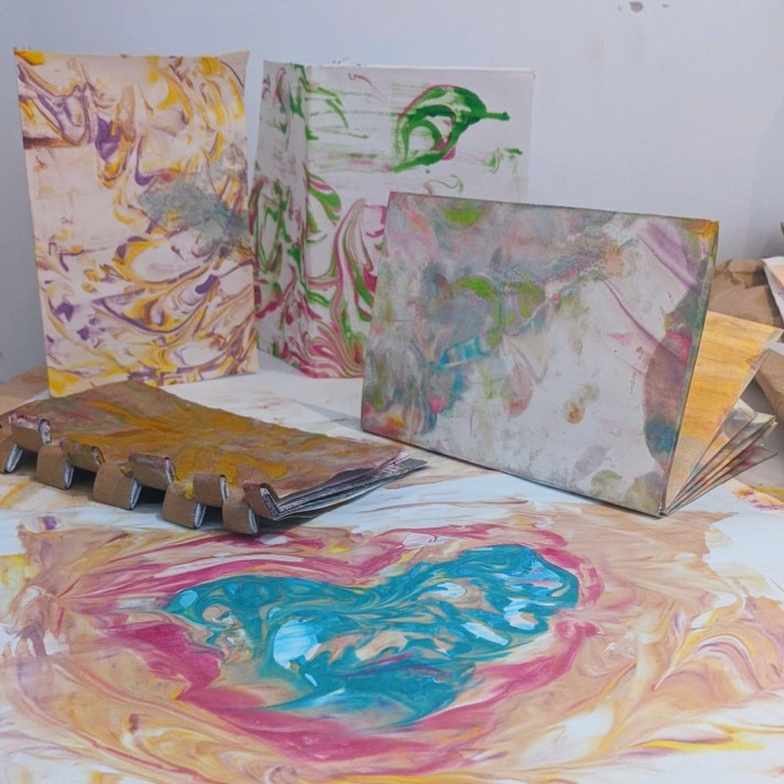“Yesterday we held session 1 of 3 of our peer support Art project. We experimented with marbling and created our own journals to work in over the next few weeks. We got very messy! But lots of laughs, chatting and young people engaging so positively”