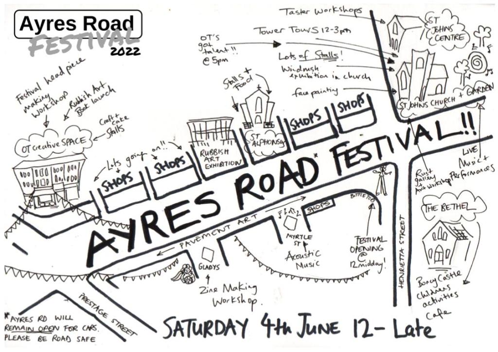 Lots of different Activities will be happening along Ayres Road between OT creative SPACE and St Johns Church including Art workshops and exhibitions, arts, crafts and food stalls, live music and spoken word, taster workshops, tower tours a talent show and activities from all the shops along Ayres Road!