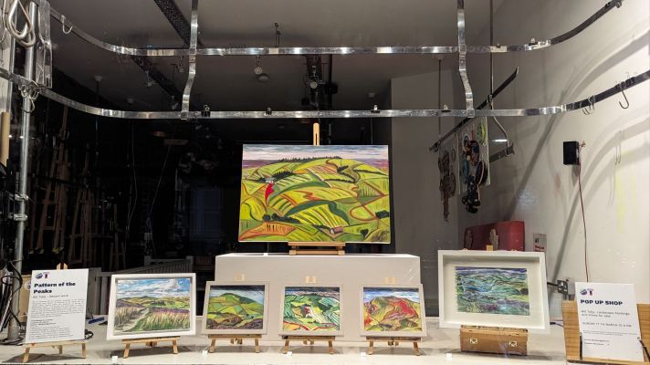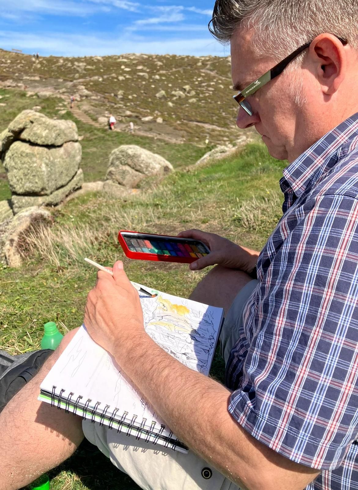 Bill is influenced by the beautiful landscape of the Cheshire /Derbyshire Peak District. He responds to the rolling hills and vibrant colour scheme within such landmarks as Shining Tor, Macclesfield Forest , The Roaches and Hope Valley. He takes a mixed media approach using Sharpie marker, watercolour, acrylic paint, as well as incorporating elements of collage within some of the paintings. His most recent work focuses on the patterns found during his walks, using iPhone and sketchbook to document the experience of the dynamic countryside.