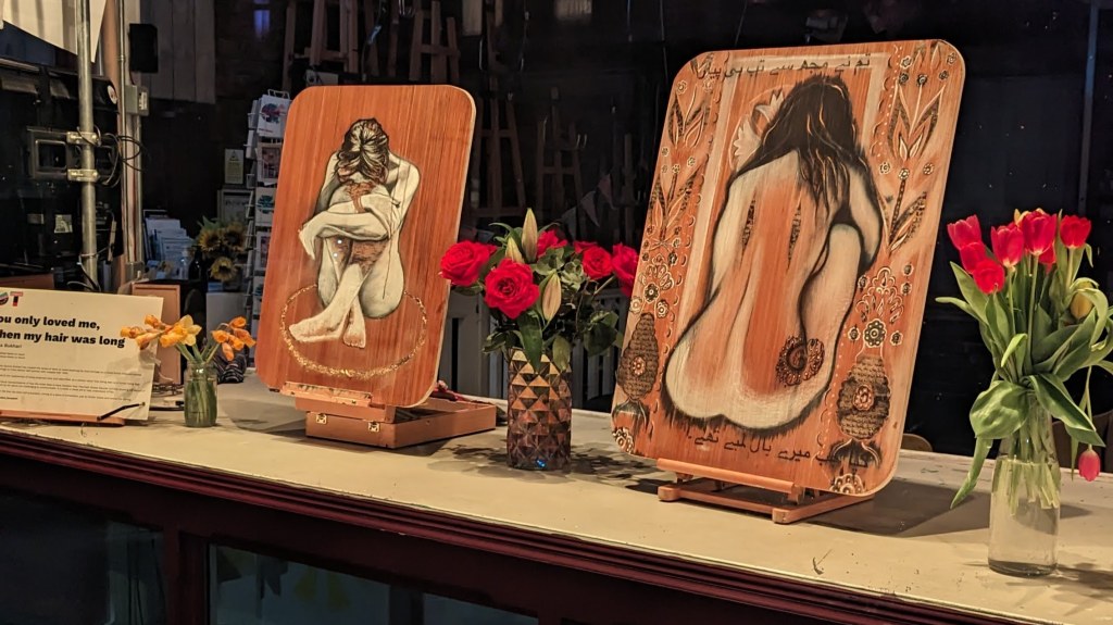 Multi media Artist Samina Bukhari has created this series of work on wood exploring her Dual heritage as a mixed British Pakistani woman.