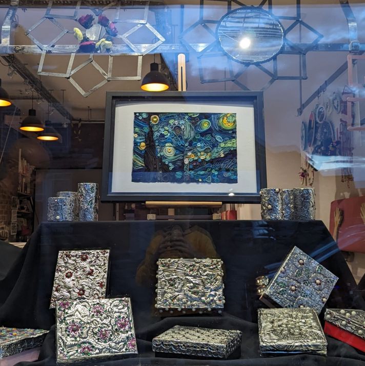 The works on display have been produced in the 9 weeks of Creative Conversation workshops where participants get creative alongside practising english conversation. Skills that have been learnt are Quilling, foil embossing, wall hangings, Dot art and glass painting.