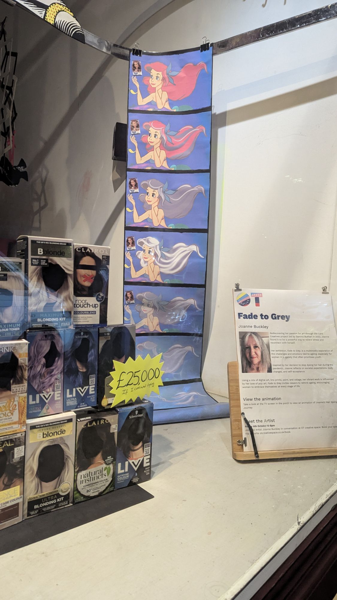 The work displayed is inspired by the Artist’s decision to stop dyeing her hair- dissecting & reconstructing the societal expectations of youth placed on our ever changing, ageing bodies.