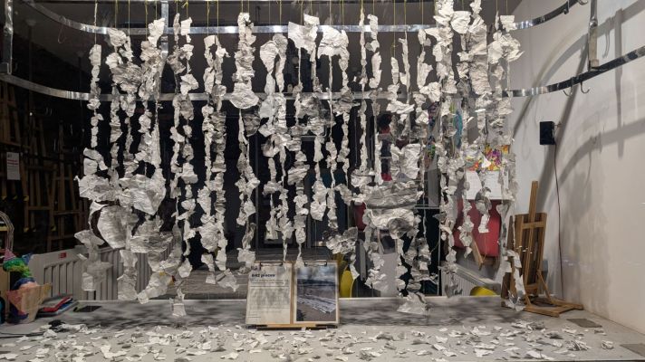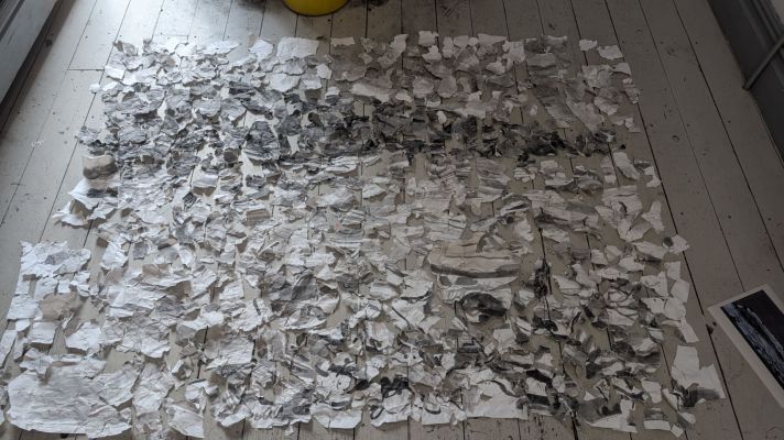 On display is an installation incorporating all 642 pieces of a drawing that was created live on Ballygally beach whilst on holiday. The original drawing captured the surrounding view of hills, sky, sea, stones, buildings and the beach. Knowing the tide was coming in I weighed down the drawing with rocks whilst I went to have lunch, happy in the knowledge that water may lap over it.