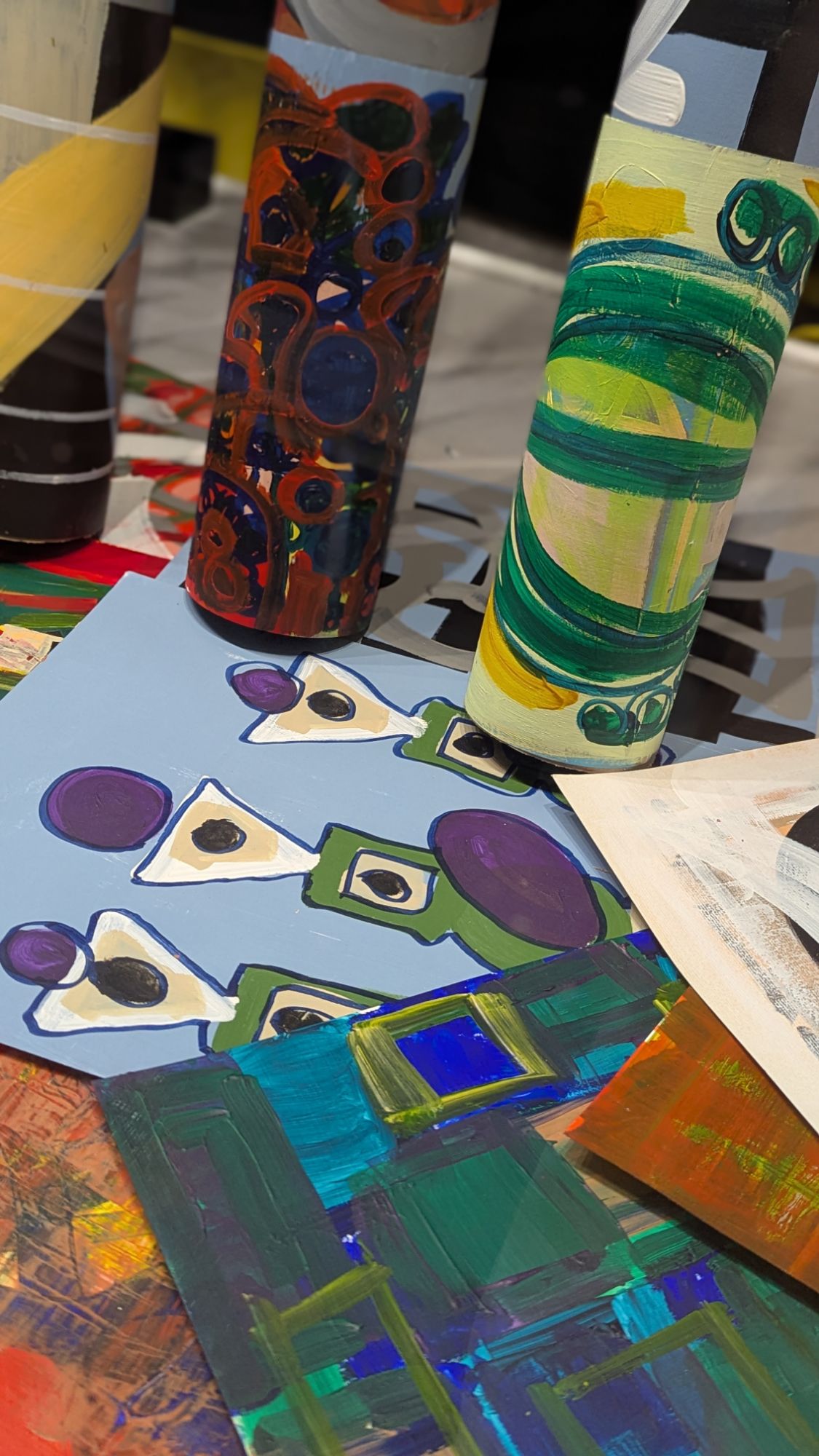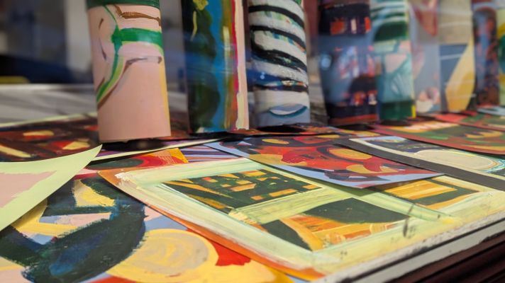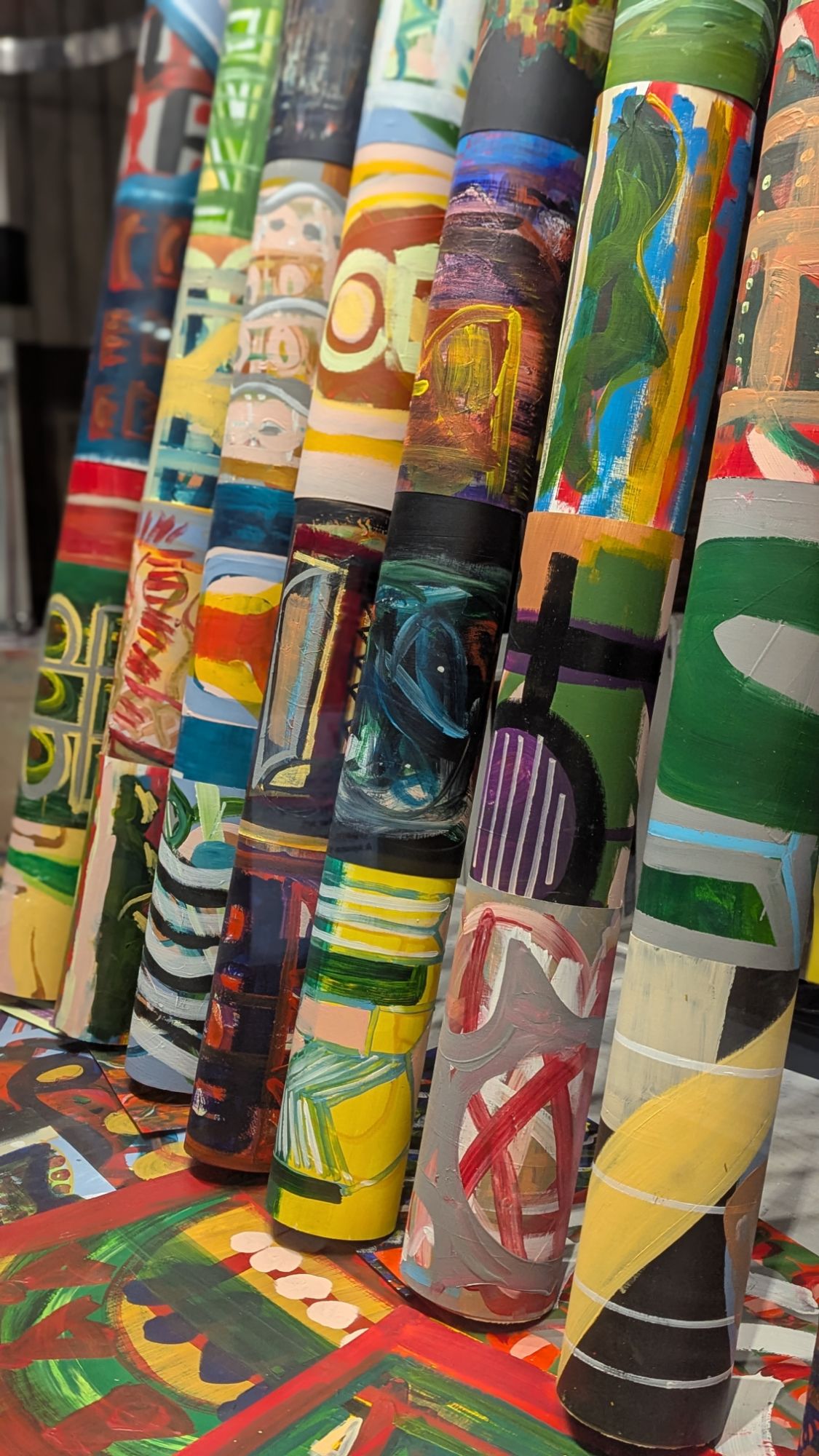 Roll Up, Roll Up is an installation of kaleidoscopic abstraction containing over 70 individual pieces of acrylic paint on paper. It moves away from the traditional forms of gallery display and takes the shop window as inspiration to present the works in a maximalist fashion to attract the attention of the passer by, with the use of the cardboard rolls a reference to the sale of cloth and other such materials, the intentional juxtaposing of the work creates new eye candy for the casual window shopper to explore and enjoy. Everything is for sale.