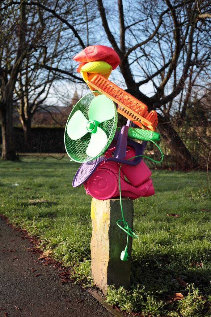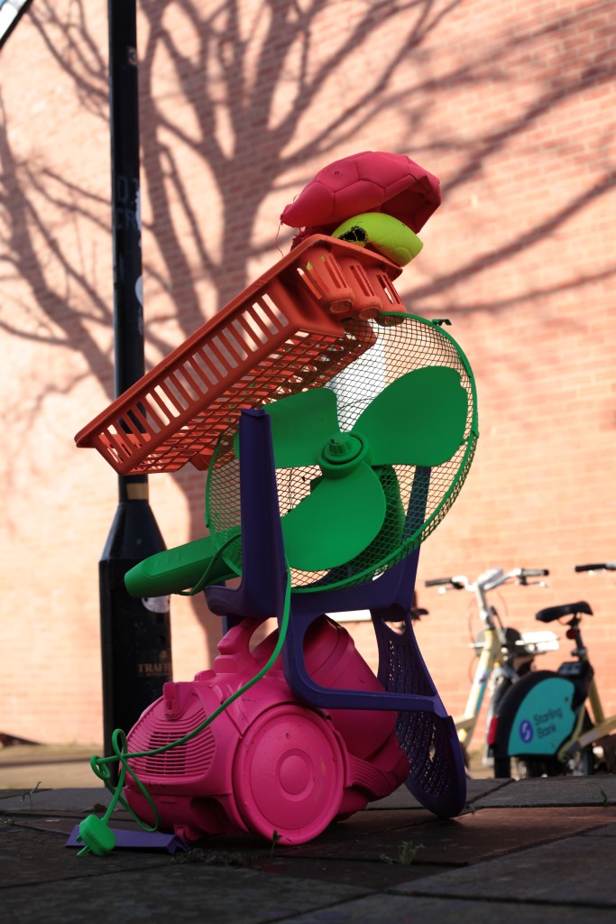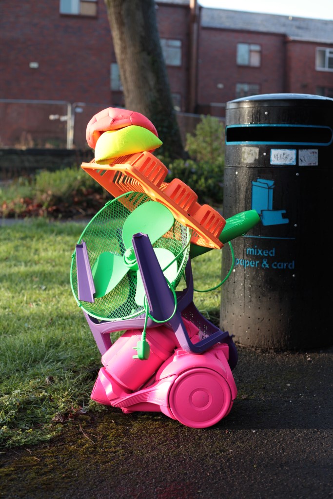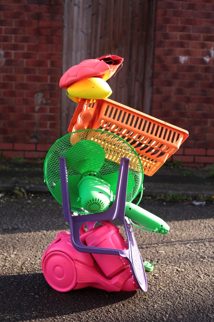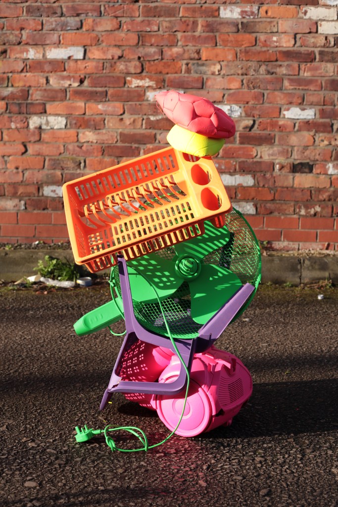 ‘Old Trafford Mountain’ is a playful yet pointed sculptural response to place, waste, and perception. Nodding to Ugo Rondinone’s Liverpool Mountain, this piece reimagines the monumental stack using discarded everyday objects found abandoned in the streets and alleyways of Old Trafford. Built from fly tipped and dumped items, the brightly coloured sculpture transforms the “ugly” and unwanted into something joyful and eye-catching.