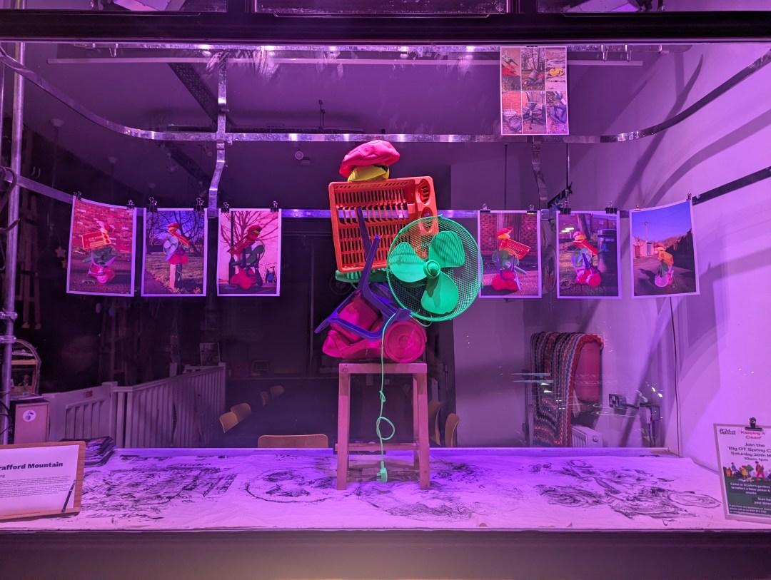 ‘Old Trafford Mountain’ is a playful yet pointed sculptural response to place, waste, and perception. Nodding to Ugo Rondinone’s Liverpool Mountain, this piece reimagines the monumental stack using discarded everyday objects found abandoned in the streets and alleyways of Old Trafford. Built from fly tipped and dumped items, the brightly coloured sculpture transforms the “ugly” and unwanted into something joyful and eye-catching.