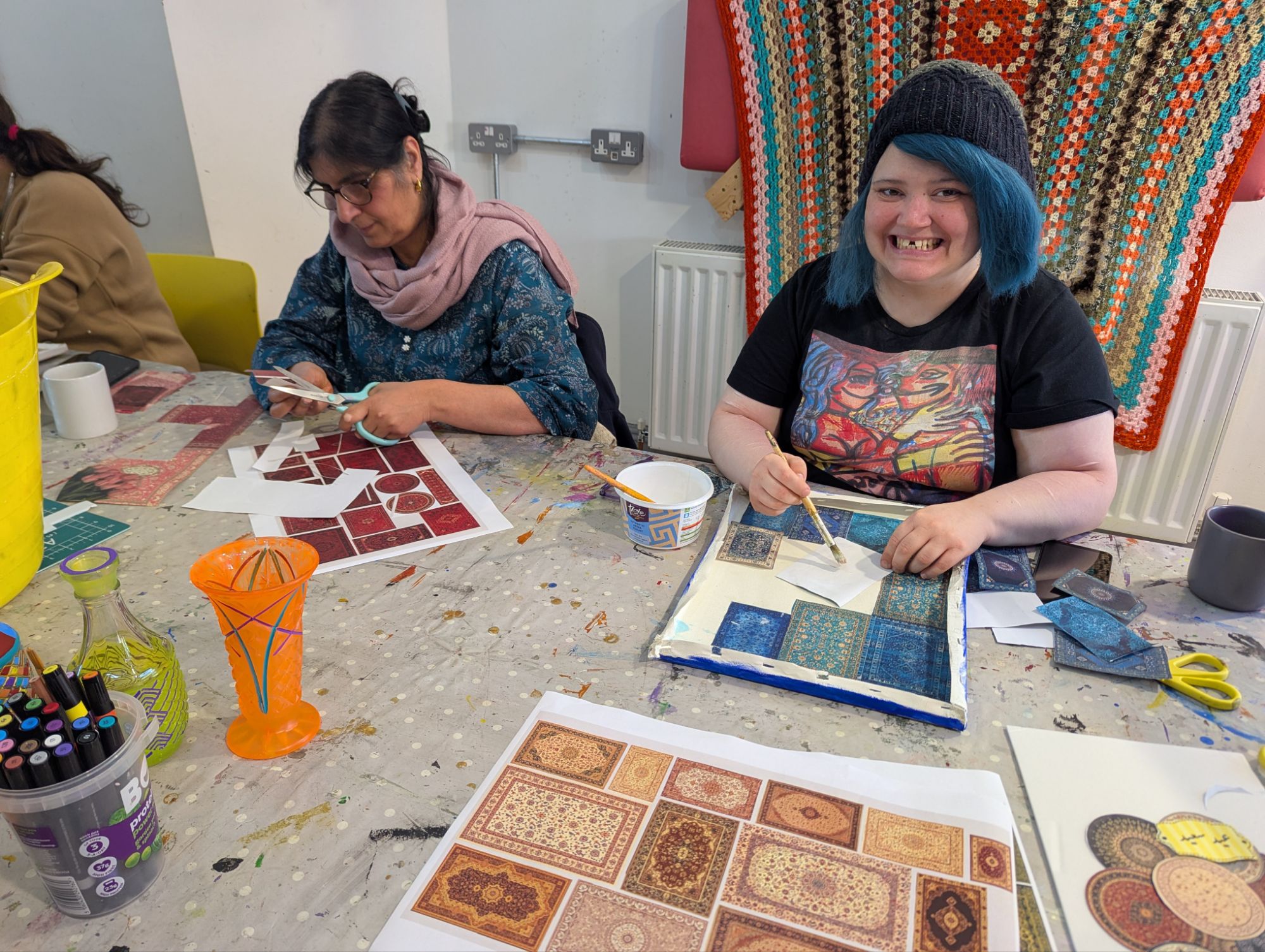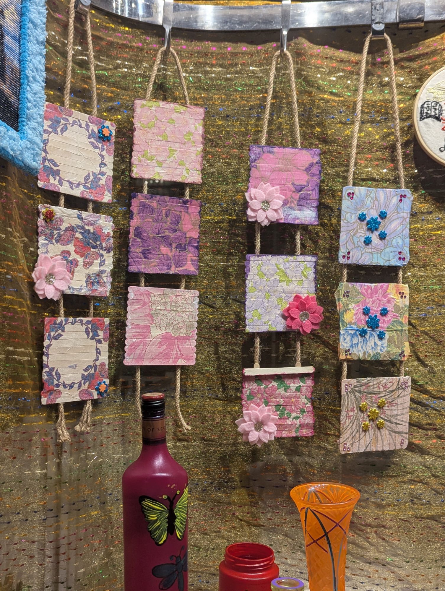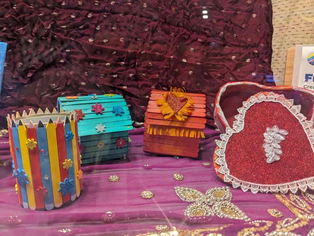 The works on display have been created this term during our Creative Connections and Creative Conversations groups, held on Tuesday and Thursday mornings. The exhibition features a wide range of pieces, including doodle and cyanotype embroidery, gem art, glass painting, carpet collage, treasure and heart boxes, pencil holders, and decoupaged wall hangings.