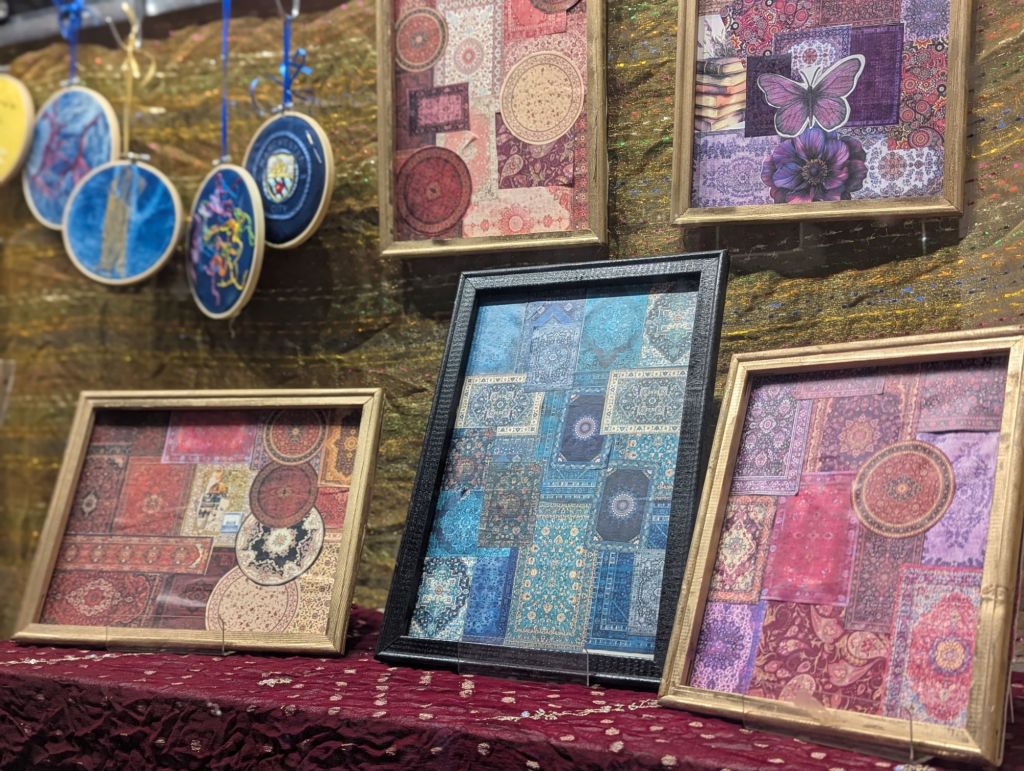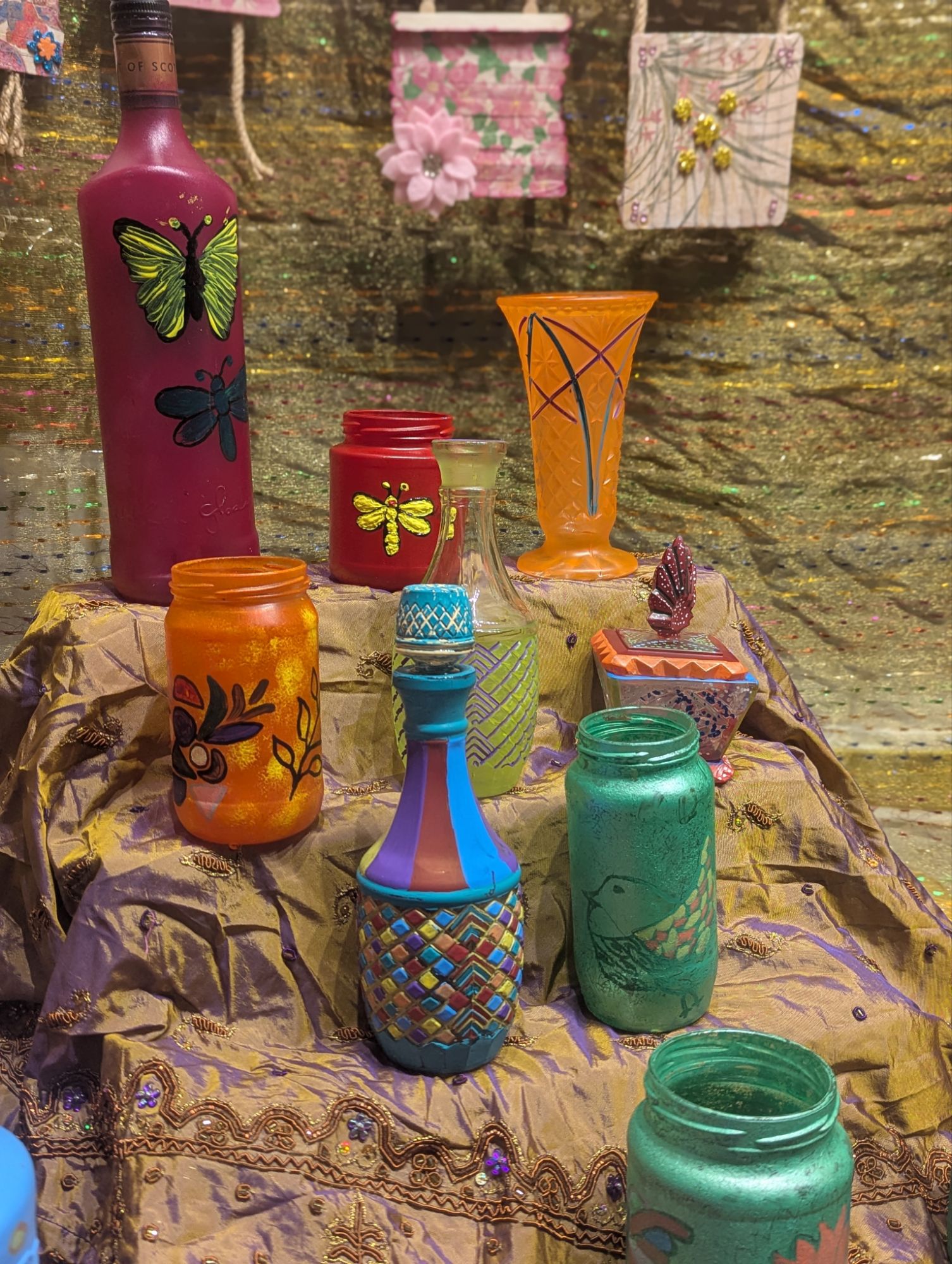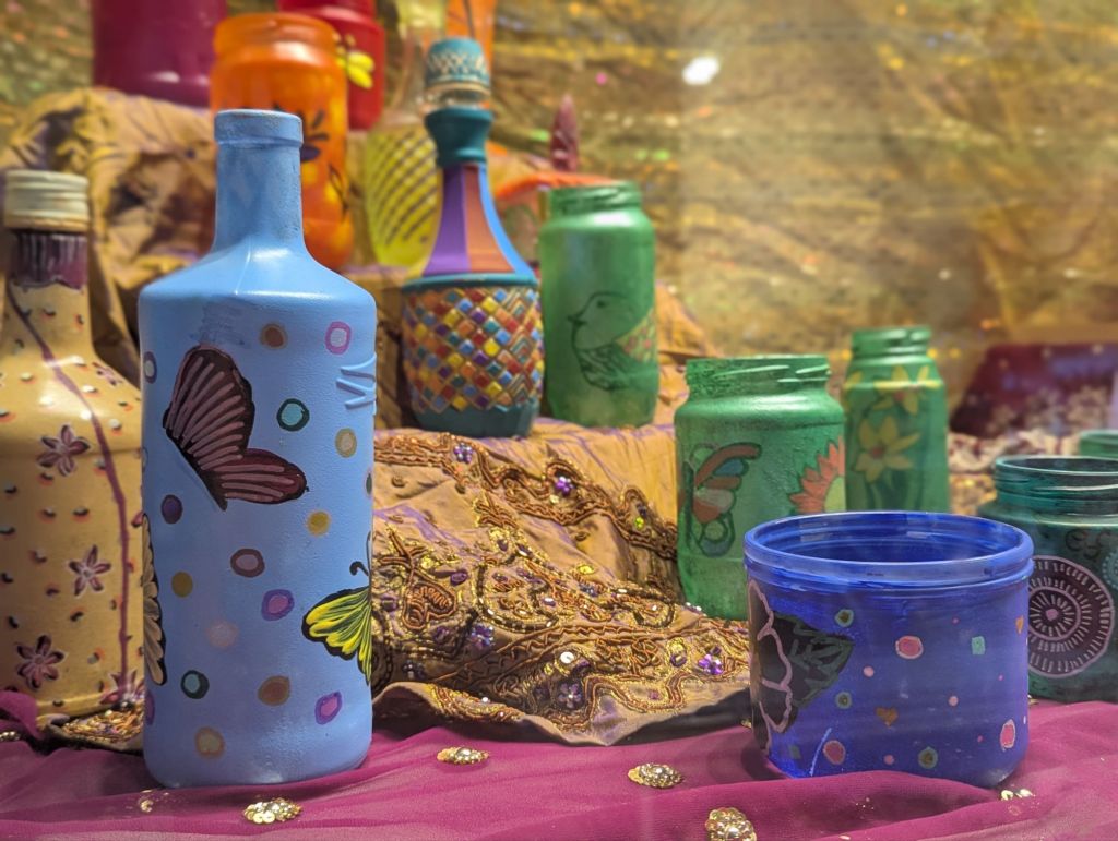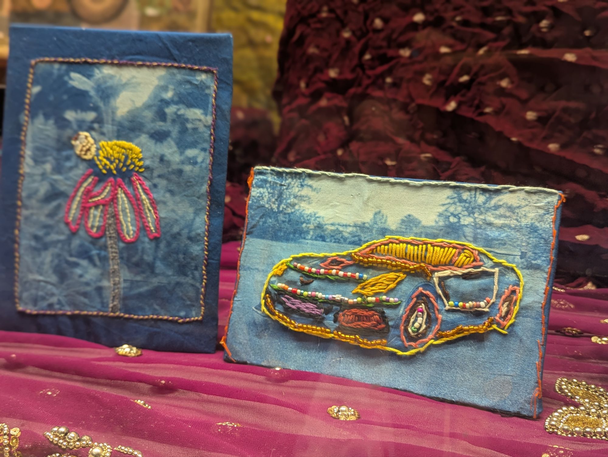 The works on display have been created this term during our Creative Connections and Creative Conversations groups, held on Tuesday and Thursday mornings. The exhibition features a wide range of pieces, including doodle and cyanotype embroidery, gem art, glass painting, carpet collage, treasure and heart boxes, pencil holders, and decoupaged wall hangings.