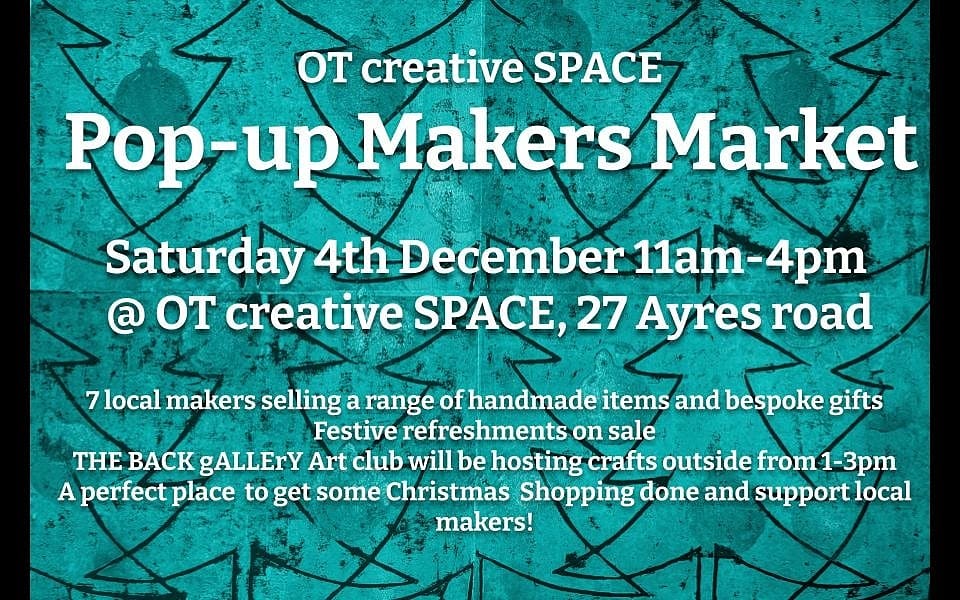 OT Creative SPACE is delighted to host our first Makers Market on Saturday 4th December with over 7 local makers and Artists selling a range of handmade items and Bespoke gifts. Pop by the studio between 11am -4pm to view the items, meet the makers and get some Christmas shopping done!! Festive Refreshments will be … Continue reading Pop-Up Makers Market 4th December