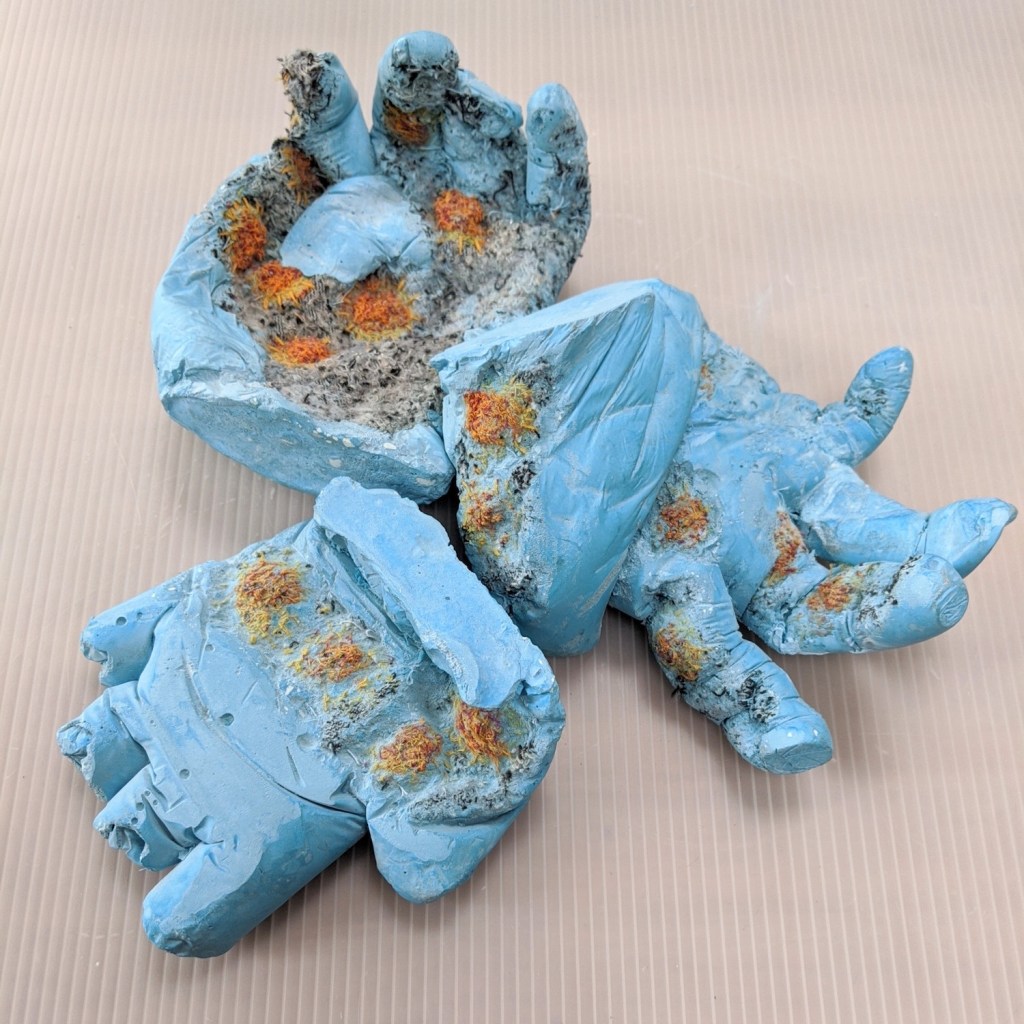 As lockdown restrictions eased, I was able to get back into the sculpture studio to do more intricate casting of 3D glove forms. The textiles were inspired by microbiological photographs of the coronavirus. The solid mass of the sculptures signifies that although the gloves are disposable and the current crisis will pass, the ramifications of the Covid-19 pandemic will be long lasting.
