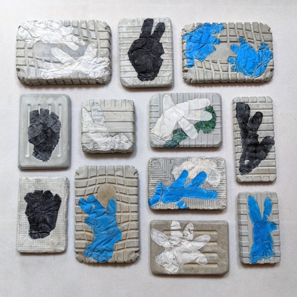 I started by developing pieces combining manipulated textiles and cement cast in plastic packaging with suitable texture to reflect the way the gloves were abandoned on pavements or caught in gutters and drains. As my collection of photographs has unfortunately grown, so has my series of cast panels. The manipulated fabric is entombed in the concrete: the disposable glove a reminder of the permanence of loss. It felt important to also respond to the tragic death of George Floyd and the Black Lives Matter protests through this series.