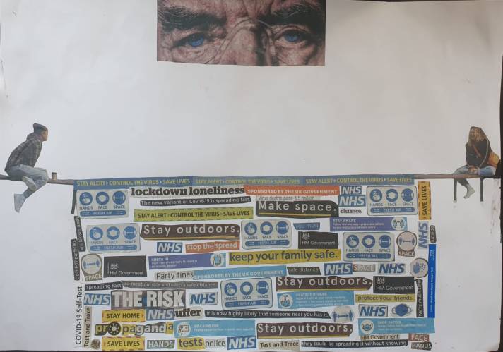 Lena Garvey • “Brexit” • This collage is made up of newspaper snippets taken from the papers published around the time of Britains departure from the european Union (31/01/2020). Its Chaotic and loud nature represents the artists feelings about Brexit and the narratives surrounding it. The collage debates space in the sense of Britian and who it belongs to, whilst its visual language provides little space to think, much like the conversation (or propaganda?) around Brexit