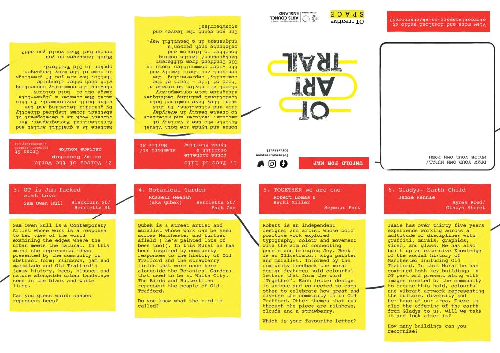 OT creative SPACE will be working with the local Primary schools, who took part in the initial workshops to generate ideas for the murals, for pupils to gain their Discover Arts Award whilst walking around the OT art trail.
