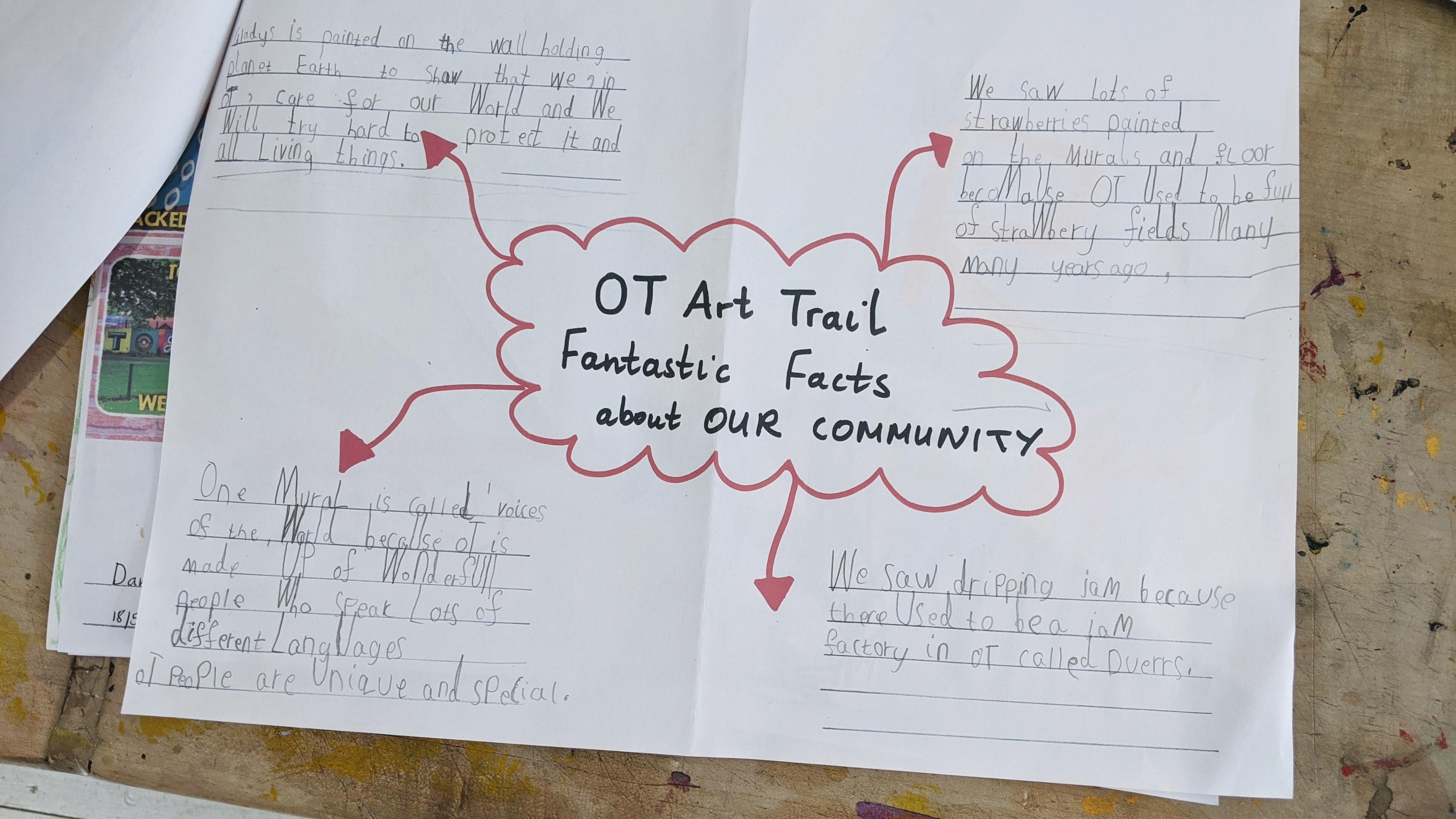 “The OT Art Trail was a fantastic experience for all the children (and staff!). Your knowledge of the murals and the area really brought the art to life and made it very relatable. It was so interesting to hear about the history of the local area and its link to strawberries. This inspired the children to include strawberries and/or jam in their own art work which they produced after taking part in the trail.The trail also covered many aspects of the curriculum as the children were given the opportunity to read and follow a map of the local area; listen to and discuss the spoken work for each mural; identify the symbolism included in the murals; and learn about abstract and naturalistic art.Participating in the trail was a wonderfully enriching and inspiring experience for all the children, and it gave them the artistry to produce some innovative and creative murals of their own.” Year 6 Teacher, St Alphonsus Primary School.