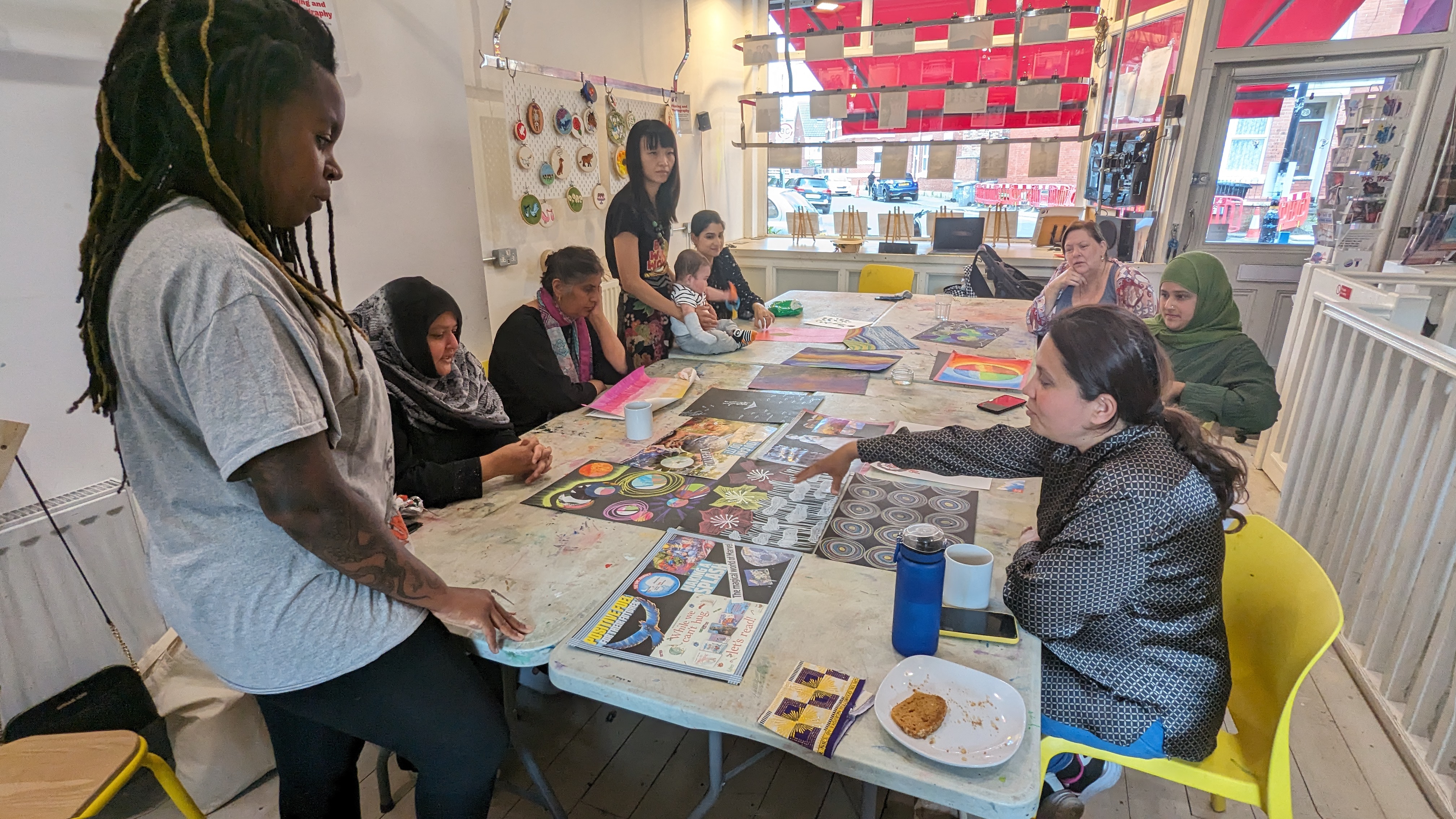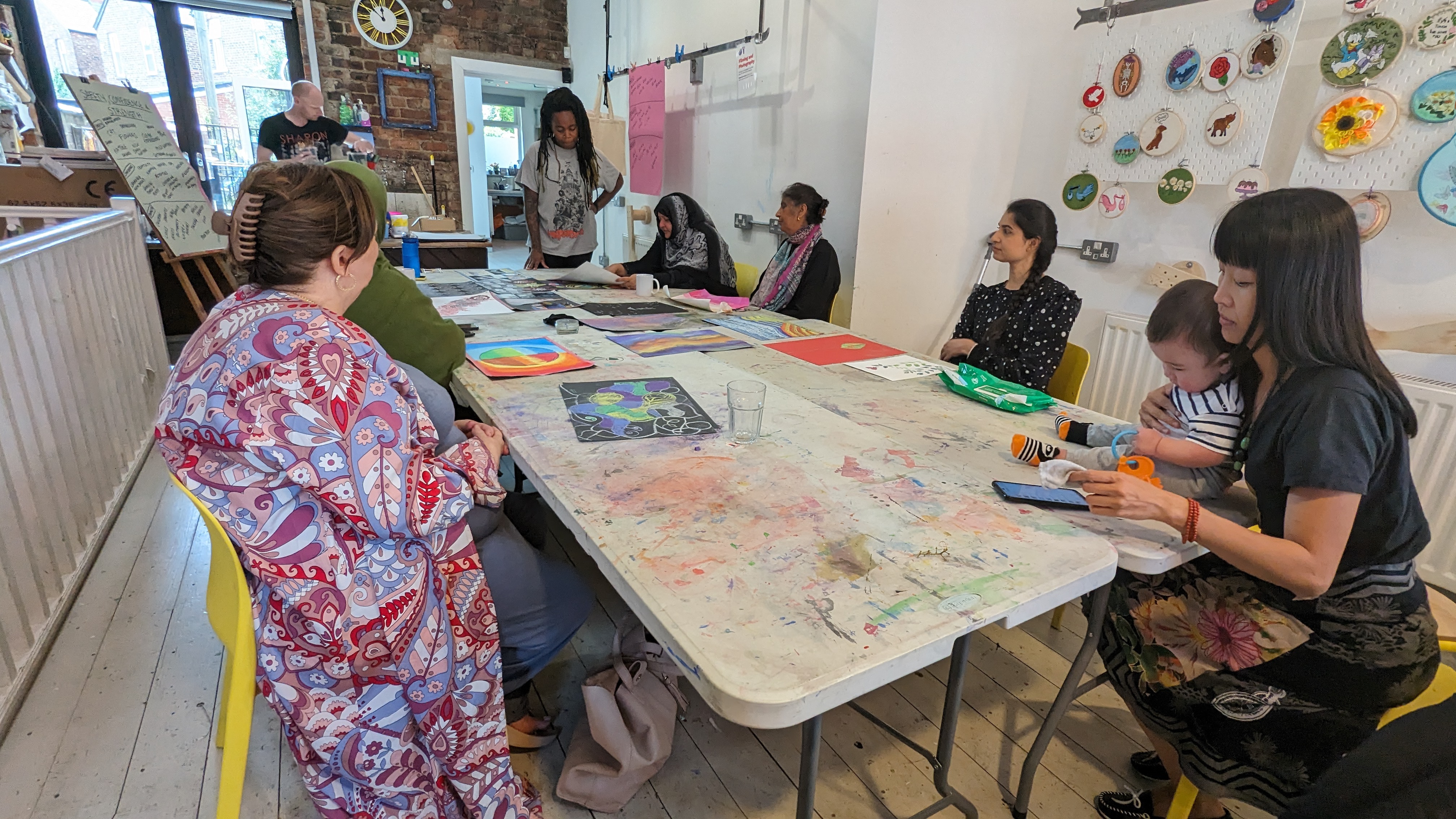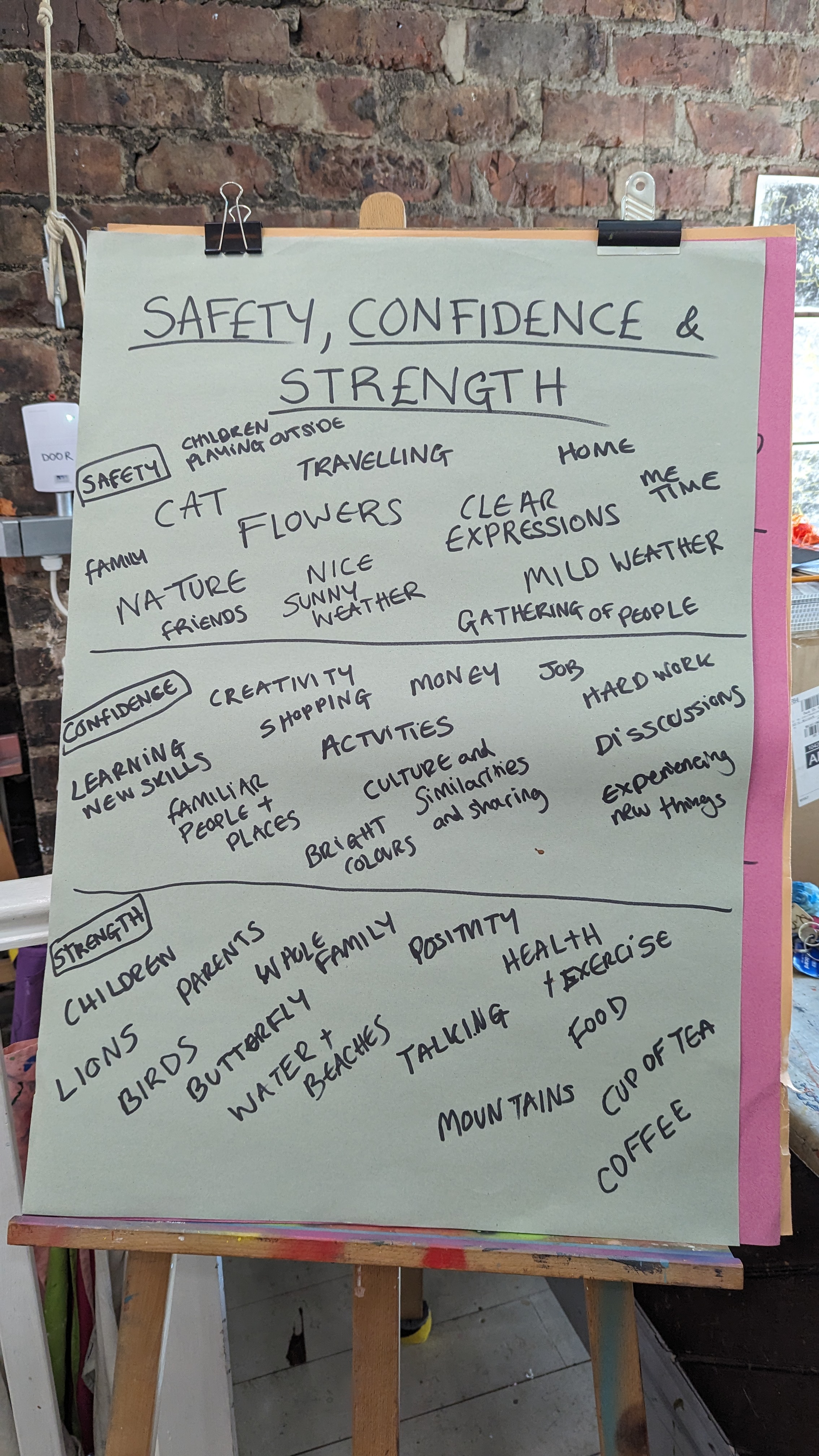 This mural has been created at part of the Right to the Streets project focussing on how we can make the streets and public spaces more welcoming and safer for women and girls and all residents. We have held workshops with groups of women, girls and local residents at the studio and the mural location to gather ideas and thoughts to contribute to the design.
