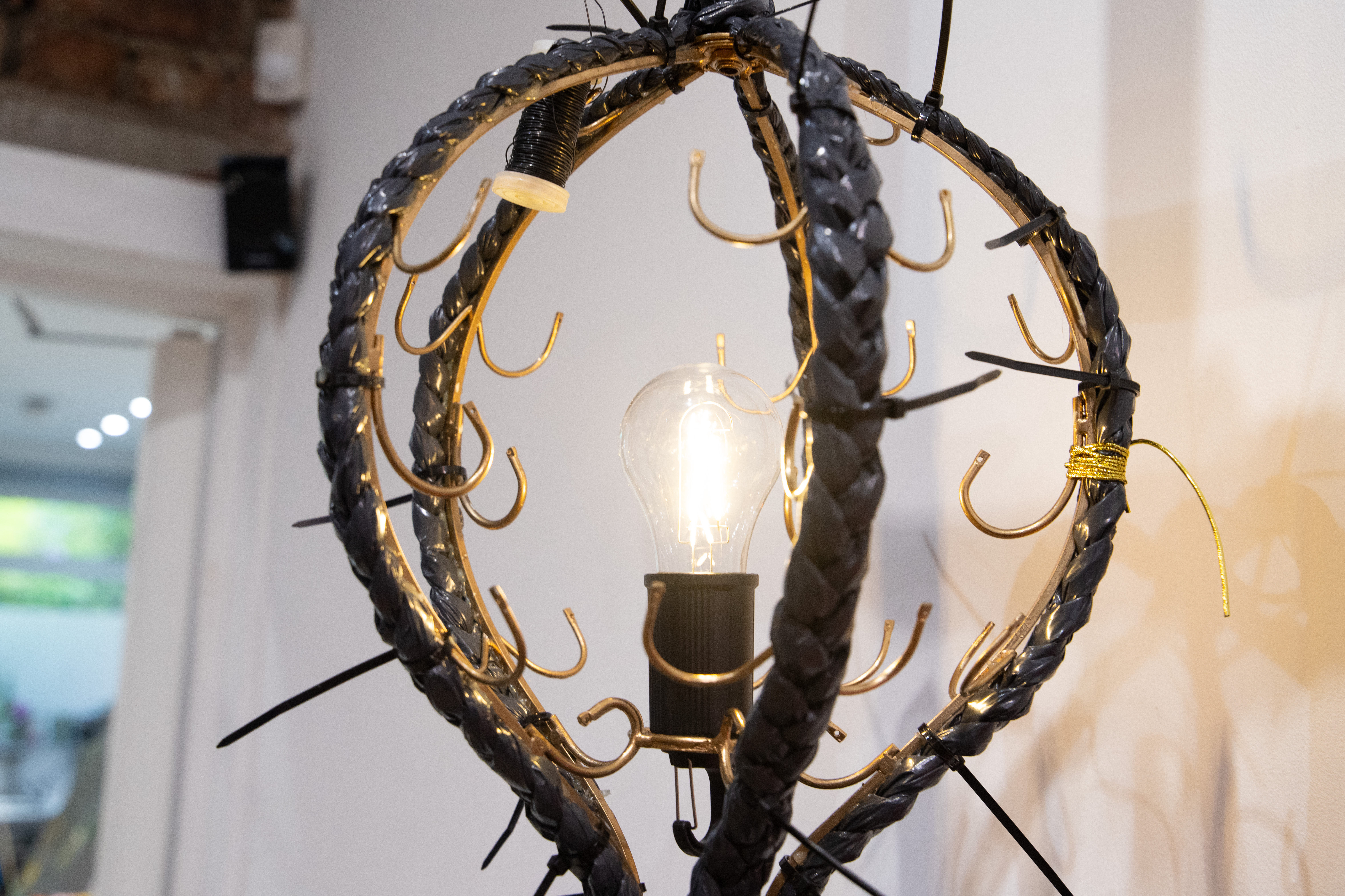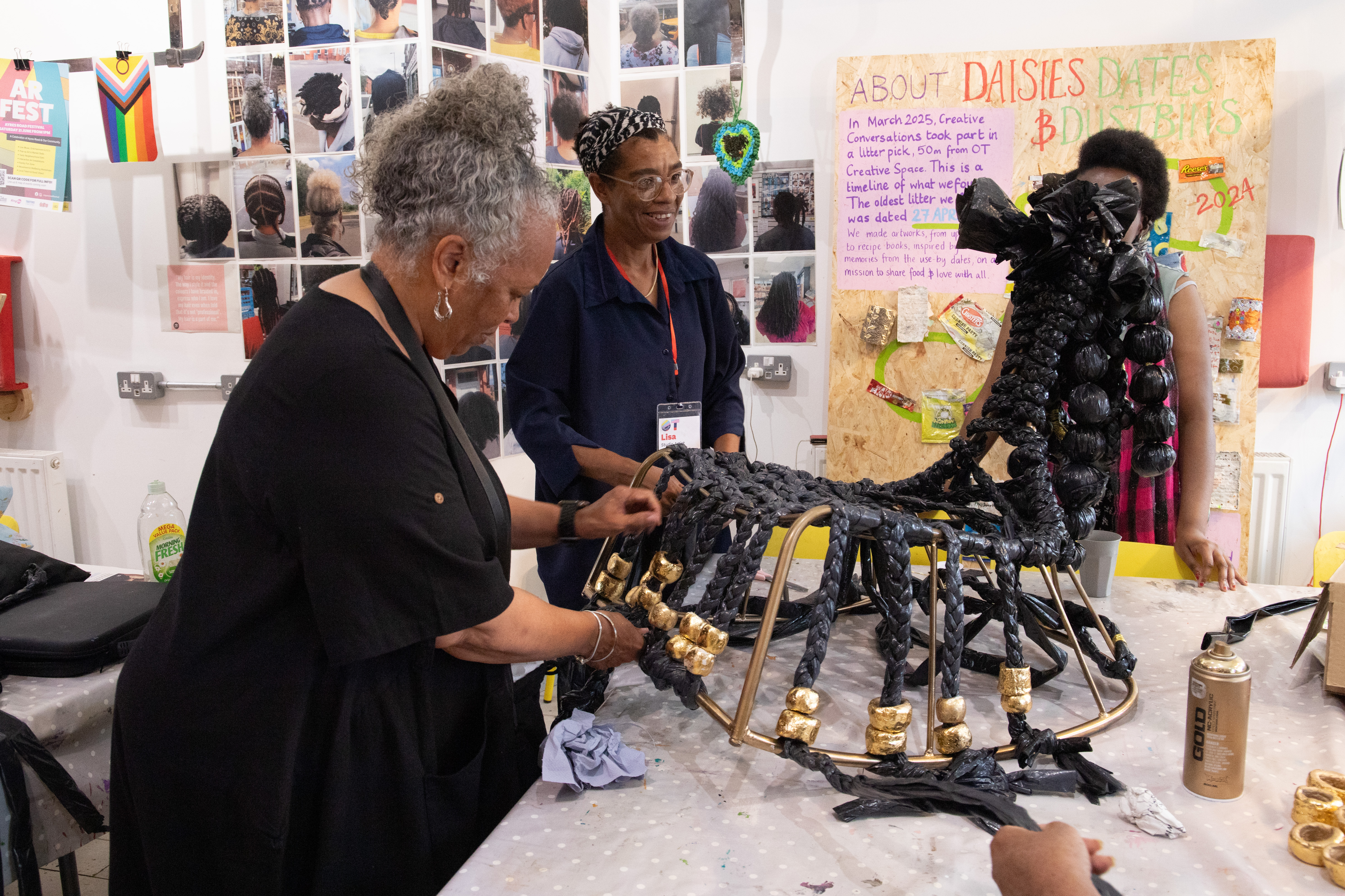 Working with a group of women at OT Creative Space, as part of the Reclaimed Narratives project, Lisa Blake has turned an old IKEA rocking chair frame into a beautiful artwork, loaded with meaning. Hanging from the broken chair are long, beaded, shiny braids, fashioned from plaited bin bags and painted clay.