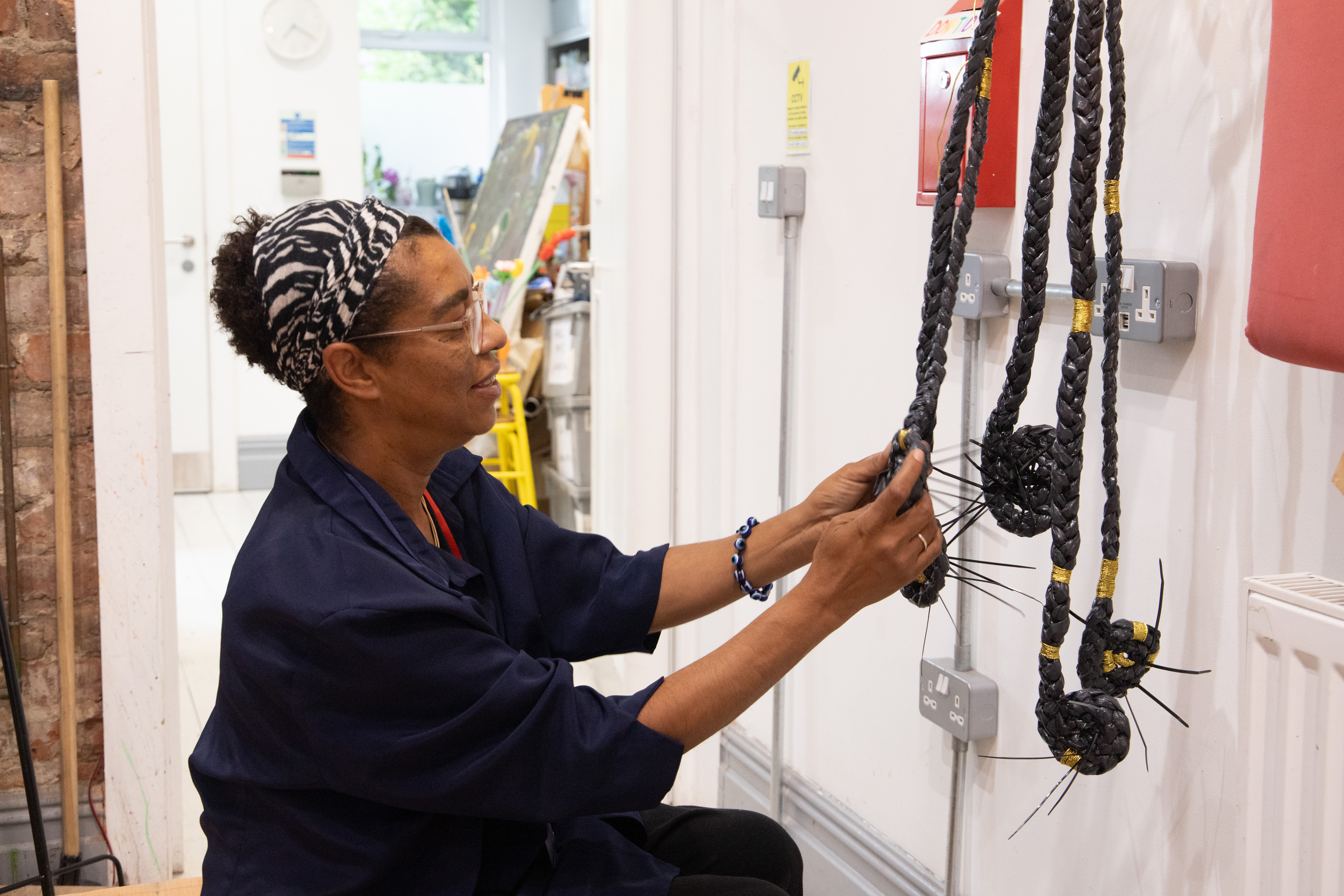 “The braids are fashioned from biodegradable bin bags, so one day, they will disintegrate and you won’t be able to tell they ever existed – I hope, like racism”