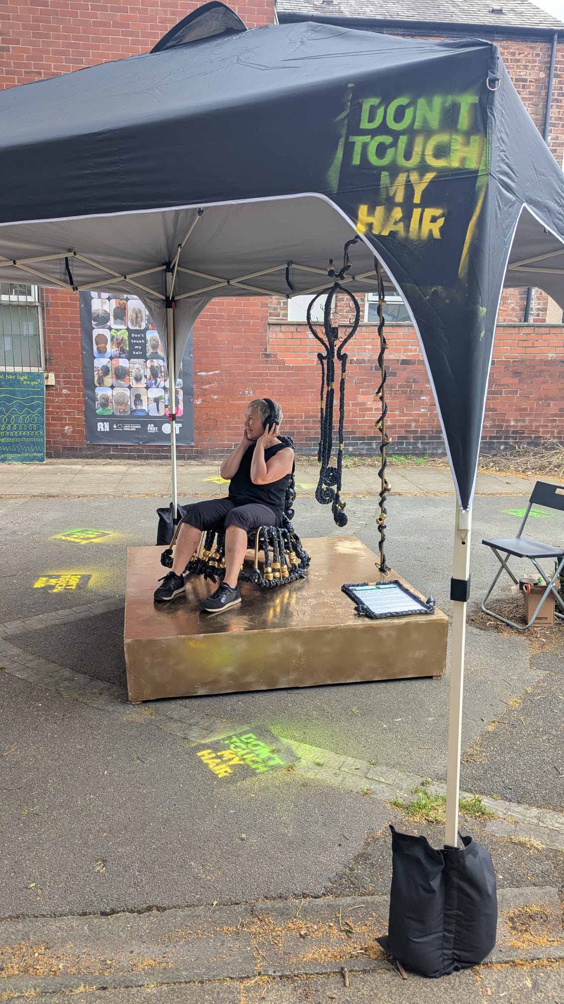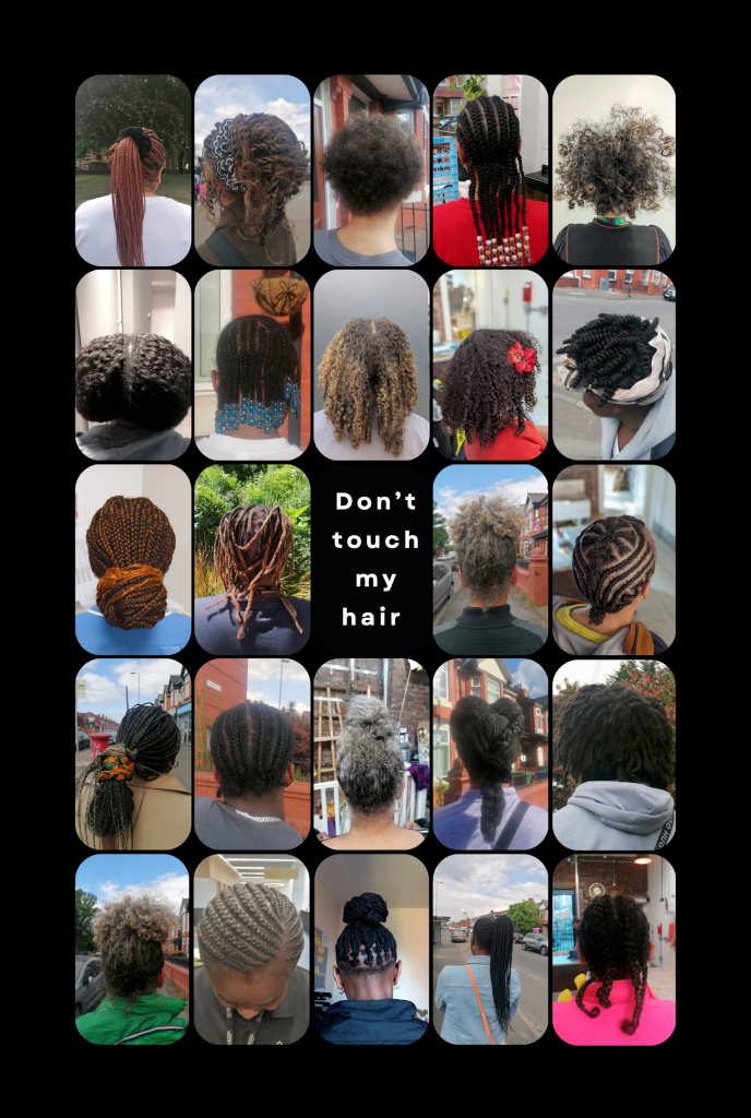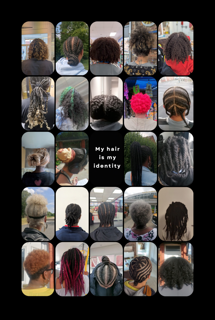 Alongside the installation are two banners with a collection of images taken by the group of afro hair, celebrating the beauty, individuality and pride of afro hair and its symbol of identity and heritage.